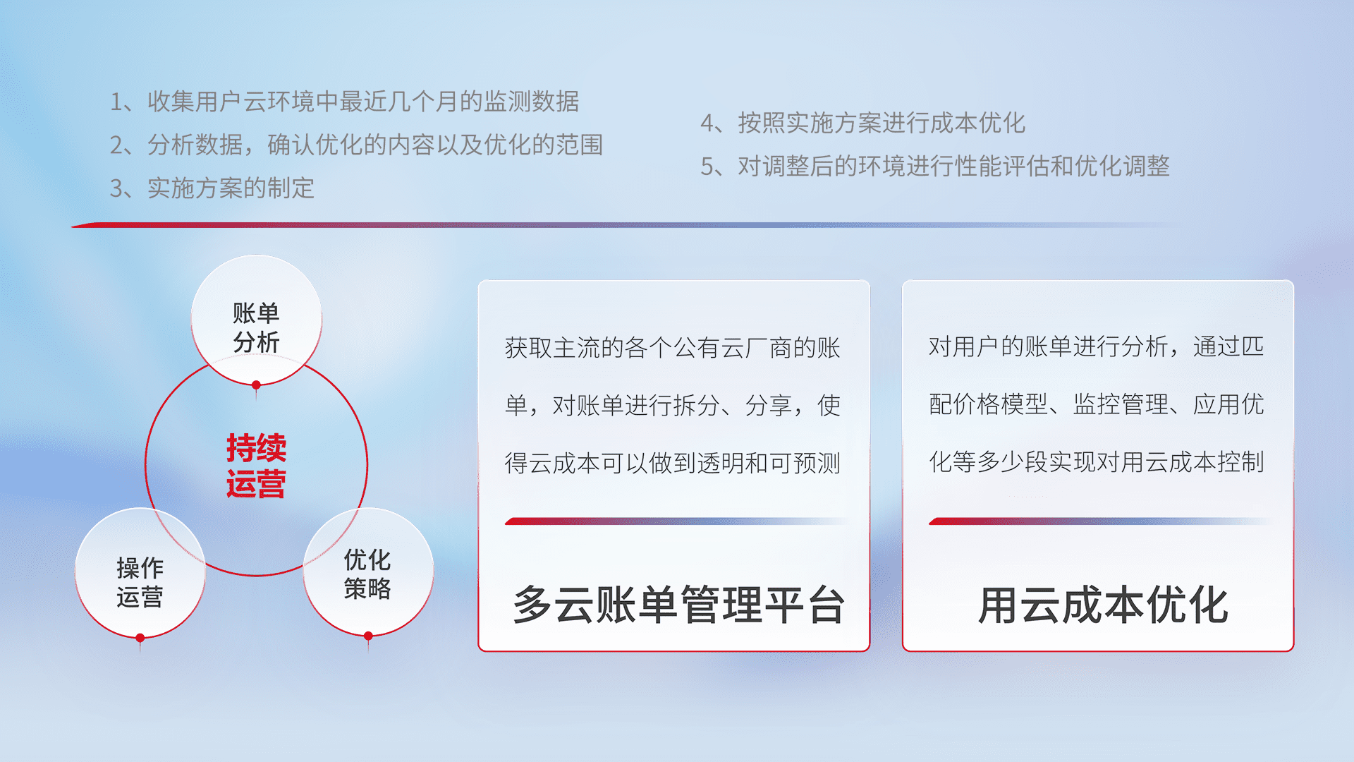 通过多云纳管,,,,以统一的资源数据模型把客户的云资源进行抽象和封装,,,进而实现对多云资源的统一操作,,,,保障云资源管理的可靠性、、稳定性与可用性。。。。量身定制化运维内容,,配置、、开发运维、、补丁管理、、、备份、、、、监控、、、认证和访问管理、、、审计和日常巡检等,,,保障在用云过程中的可靠度,,,,稳定度以及高可用率。。。